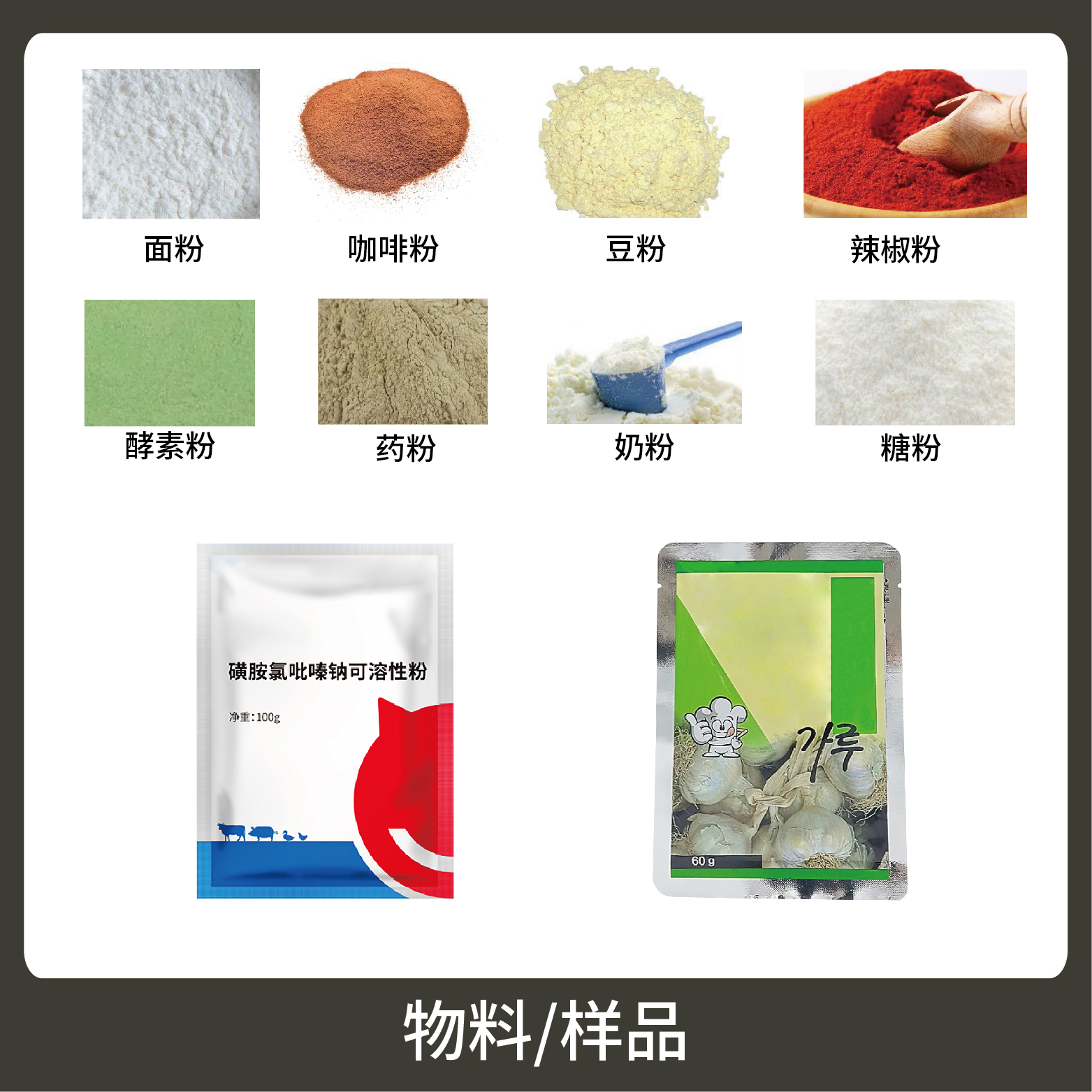 1、適用于食品、醫(yī)藥、化工、化妝品行業(yè)中顆粒、粉劑、液體、醬料等物品的計量包裝,如:調味粉、蛋白質粉、營養(yǎng)粉等。