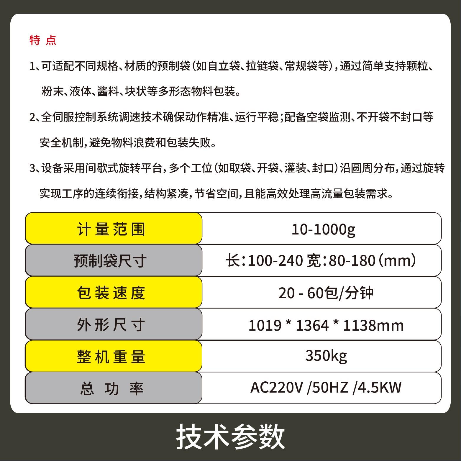 2、全伺服控制系統(tǒng)調(diào)速技術(shù)確保動作精準(zhǔn)、運行平穩(wěn);配備空袋監(jiān)測、不開袋不封口等安全機制,避免物料浪費和包裝失敗。